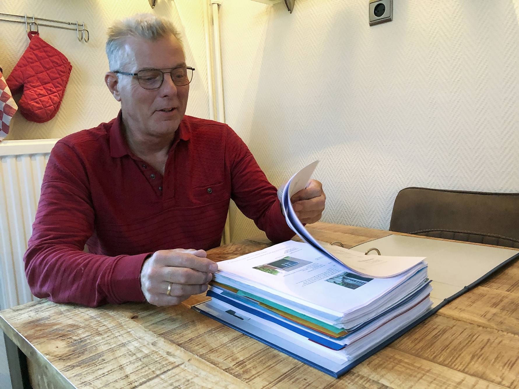 De keukentafel van Jacob en zijn vrouw is stevig genoeg om tegen een stootje te kunnen. Maar als hij de zware en vuistdikke dossiermap met administratieve bevingsellende op het tafelblad legt, menen we licht gekraak te horen. Jarenlange correspondentie met de NCG, NAM, het CVW en de TCMG telt op. Weliswaar is de brief- en mailwisseling met ons niet meer dan een vinger dik, maar toch. Elk document is er een.